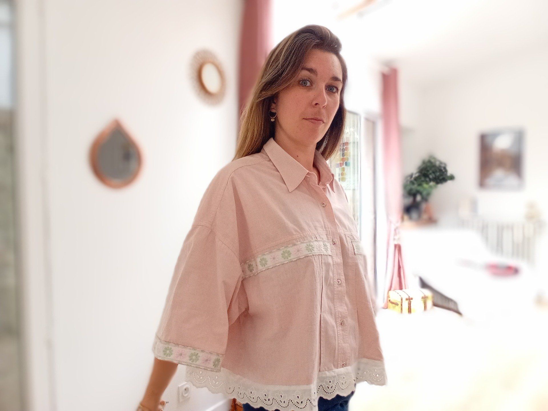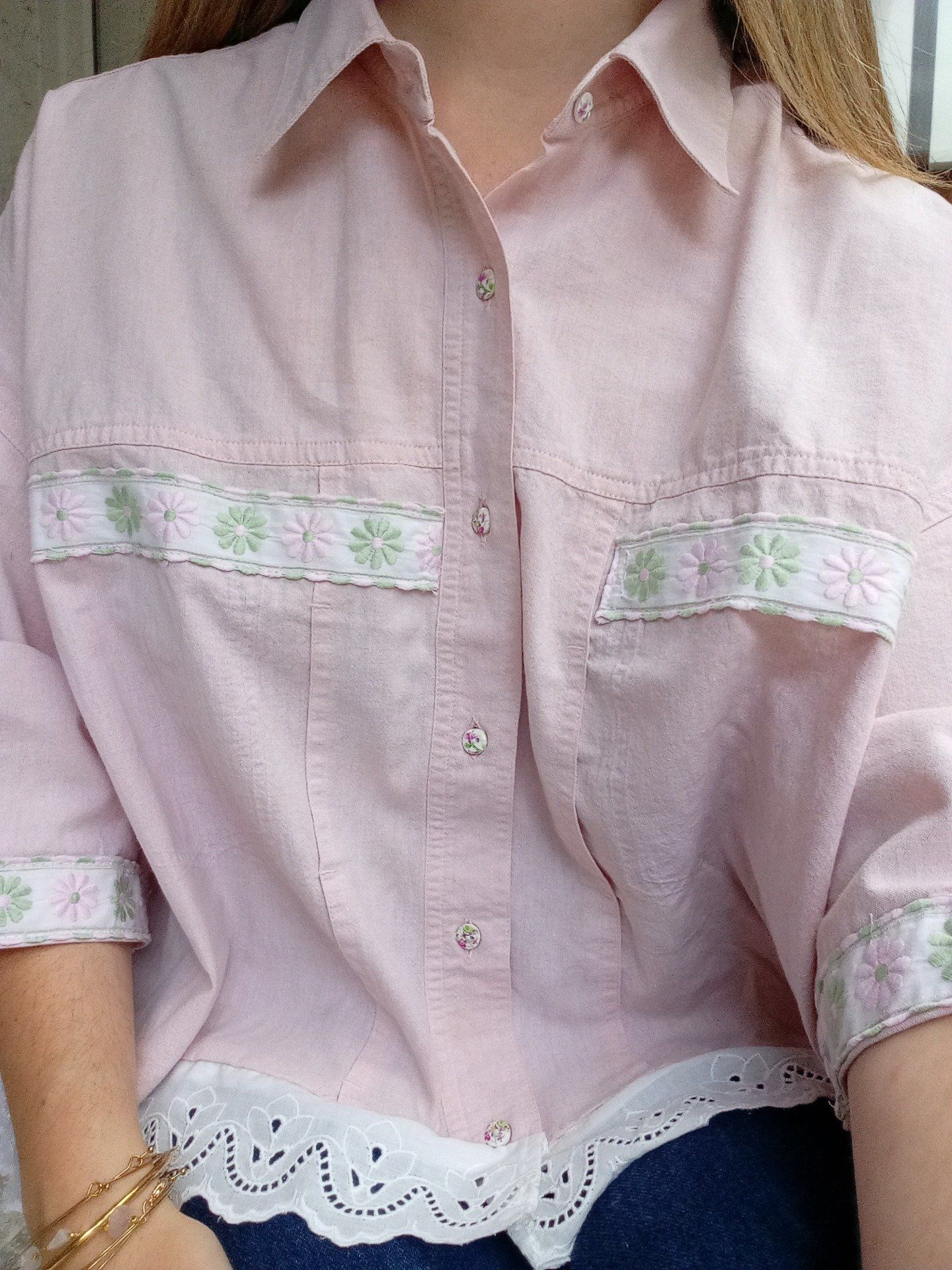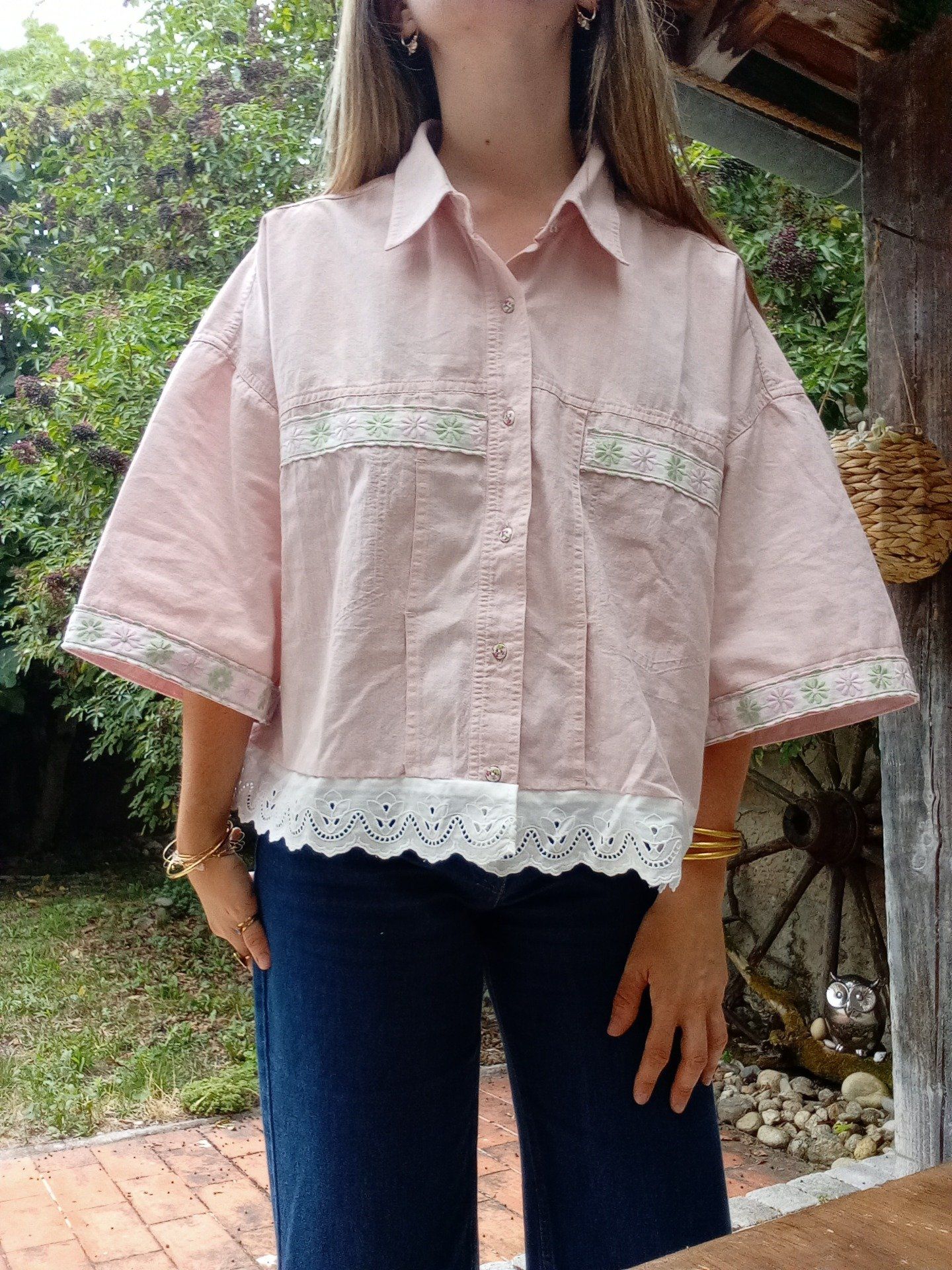 Les détails du chemisier : Biais 100 % coton ajouté aux poches sur le devant ainsi que en bas des manches / Boutons ornés de fleurs vintage / Bas du chemisier orné de dentelle