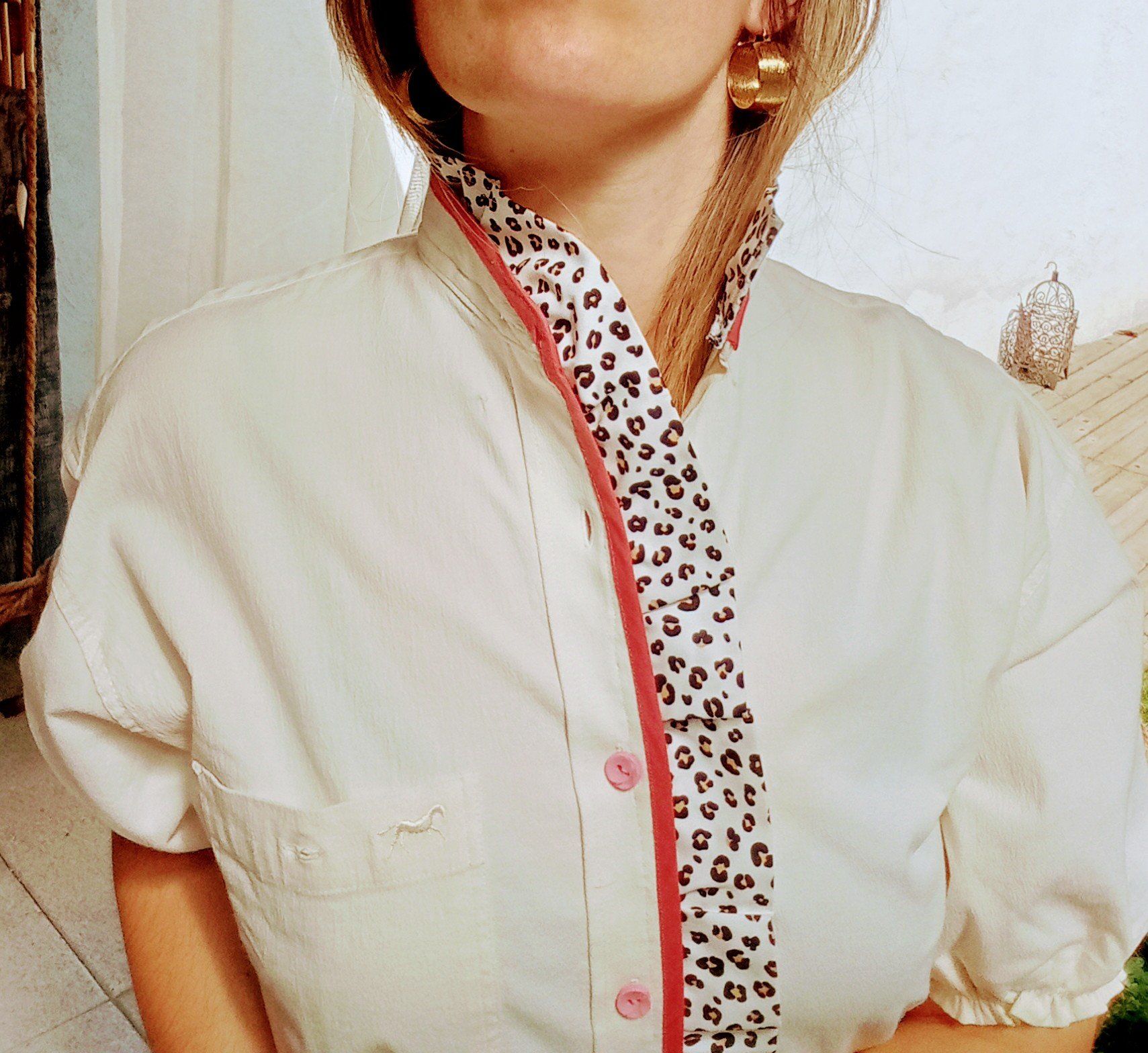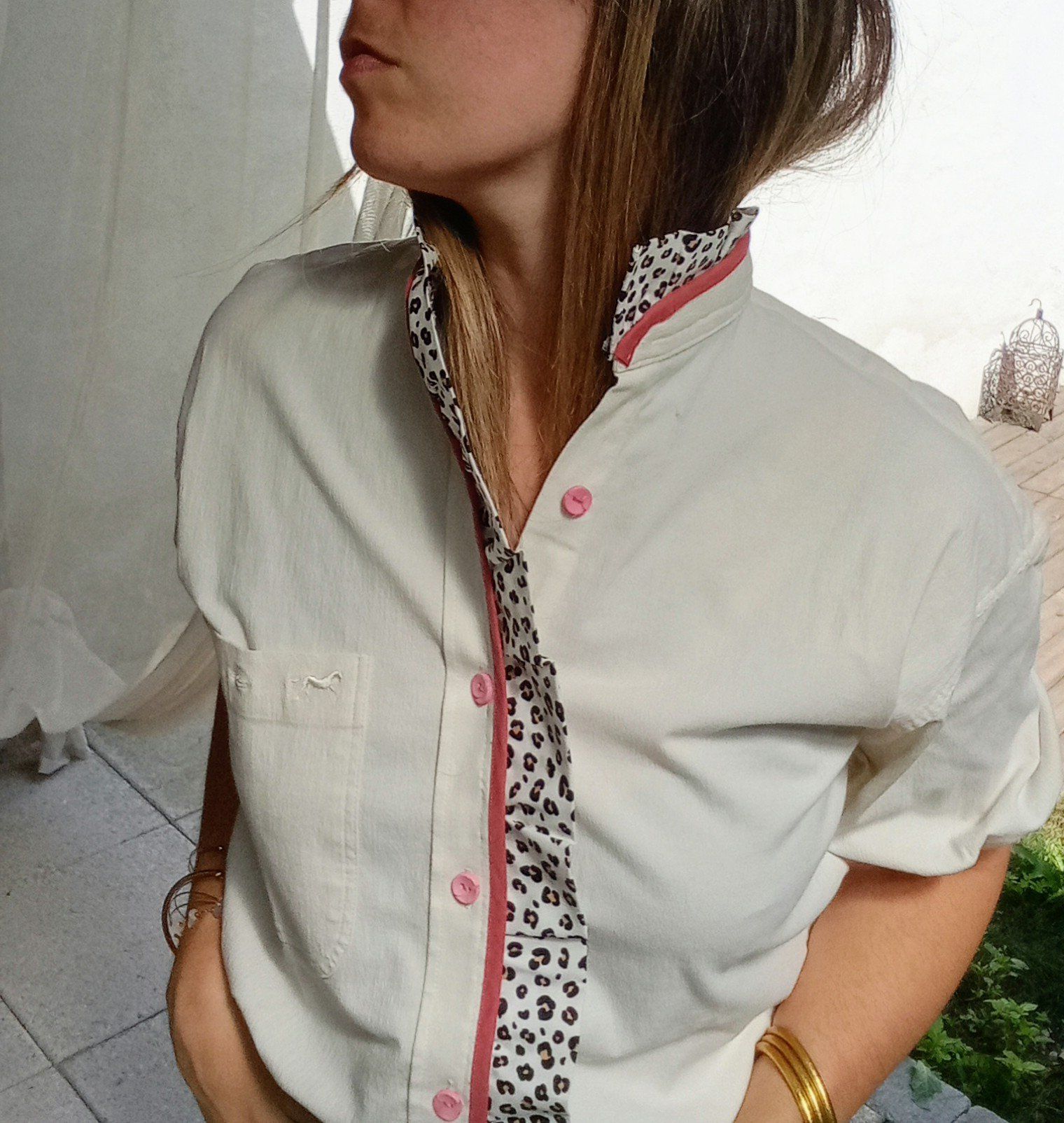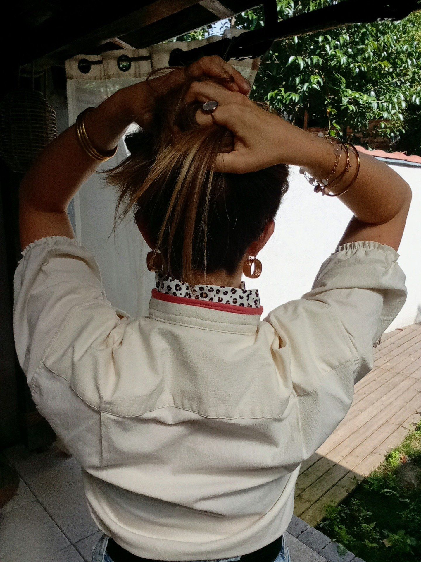 Les détails du chemisier : Col montant froncé / Biais coton soulignant le devant / bas de manches élastiqués /